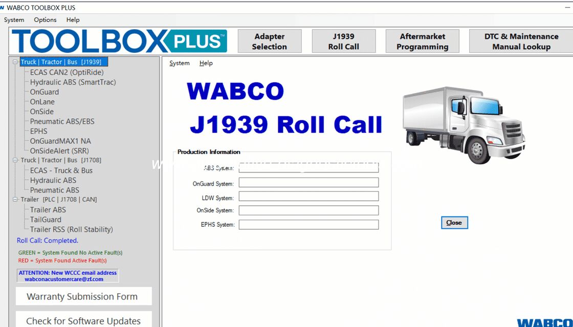 Características clave 1- Diagnóstico completo:TOOLBOX PLUS admite diagnósticos para sistemas WABCO, incluidos ABS, sistemas de frenado electrónico (EBS), sistemas de control de estabilidad y características de seguridad como la mitigación de colisiones. 2. Programación en ecus:Los técnicos pueden reprogramar las ECU WABCO, lo que permite actualizaciones y recalibraciones para la optimización del sistema y el cumplimiento normativo. 3. Monitoreo de datos en tiempo real:El software proporciona datos en tiempo real, lo que permite a los técnicos monitorear las funciones clave del vehículo, como el rendimiento del freno y el control de estabilidad. 4. Pruebas y calibración del sistema:TOOLBOX PLUS permite a los técnicos probar los componentes del sistema, asegurando la correcta instalación y funcionalidad. También admite la calibración de ABS y otros sistemas de seguridad crítica. 5. Dirección de DTC:Recuperar y borrar los códigos de problemas de diagnóstico (DTC) para acelerar el proceso de reparación y reducir el tiempo de inactividad.